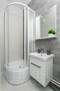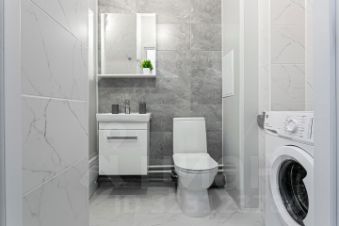 Просторная ванная комната оборудована тёплым полом, душевой кабиной и стиральной машинкой;