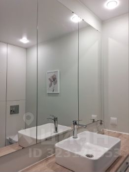 - встроенная мебель для ванной с умывальником, большой столешницей и огромным зеркалом
