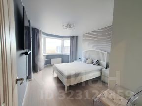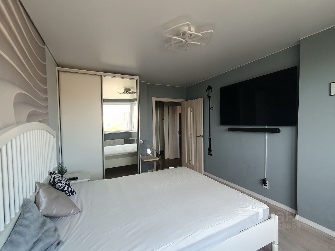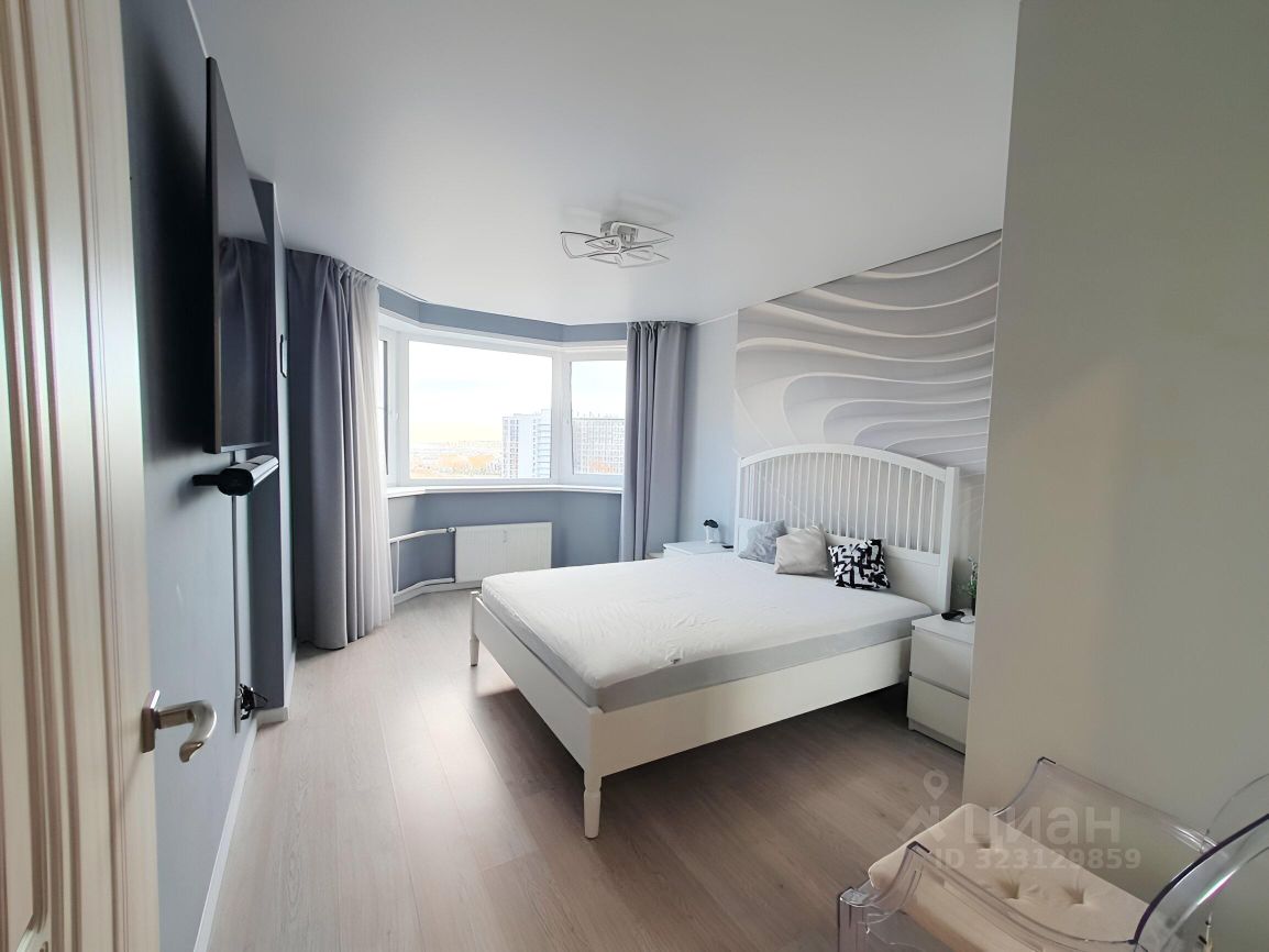 Просторная и светлая спальня: эркерное окно, двухспальная кровать, большой телевизор (65"), шкаф-купе.