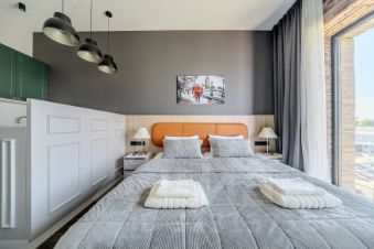 Высокие потолки, дорогая отделка и техника. Шкафы от пола до потолка со внутренней подсветкой обеспечивают огромное место для хранения вещей.