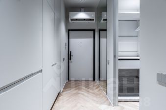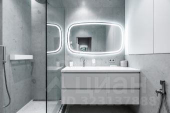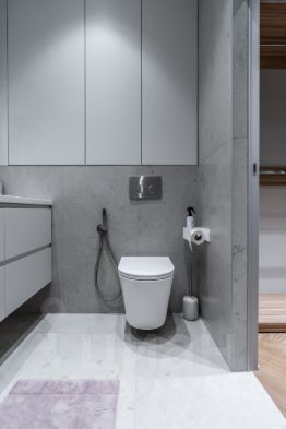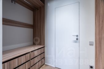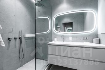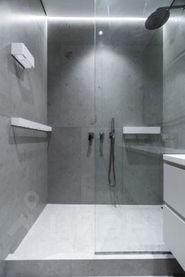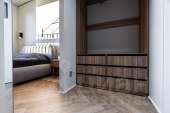 Раздвижная зеркальная дверь в мастер-гардероб с двумя высокими шкафами, далее ванная с душевой кабиной и теплым полом.