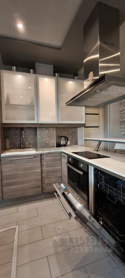 Кухня оснащена плитой, духовым шкафом, посудомоечной машиной, встроенном холодильником,
