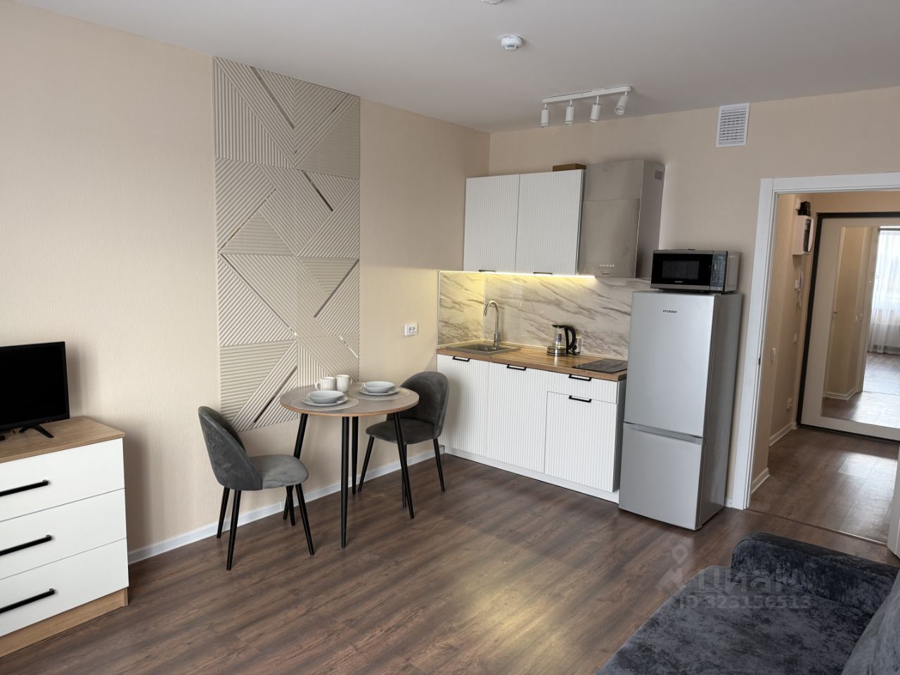 Стиральная машина, двухкамерный холодильник, встроенная плита, вытяжка, микроволновка, чайник, телевизор, кухонный гарнитур, раскладной диван 140190, стол, 2 стула, комод.В прихожей — большой трёхдверный шкаф , удобная вешалка, а так же зеркало на входной двери .Также есть новое постельное бельё, подушка, сушилка для белья, посуда и приборы на 2 персоны.