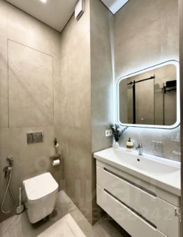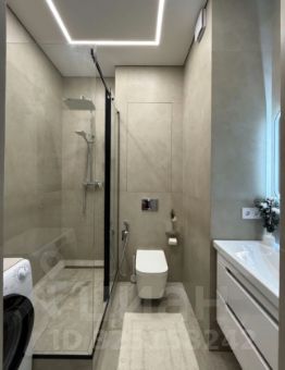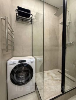 -Совмещенный санузел с душевой кабиной, стиральной машиной и зеркалом с подсветкой.