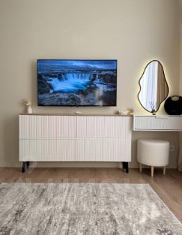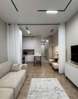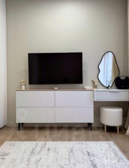 -В зоне спальни большой раскладывающийся двухспальный диван. Но кровать, которая будет занимать пространство, это важно для студии. Также есть телевизор , вместительный комод и туалетный столик с красивым зеркалом.