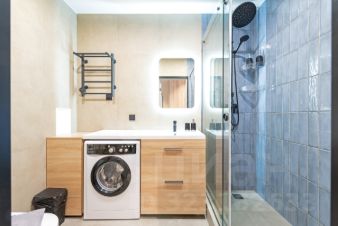 В ванной комнате: туалет, душ, стиральная машина, фен, утюг.