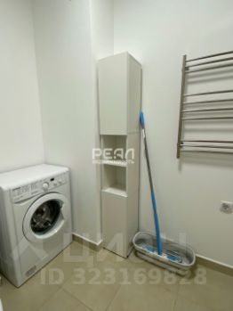 В ванной подвесной шкаф с полками и зеркалом, шкаф-пенал, стиральная машинка, комплект для уборки.