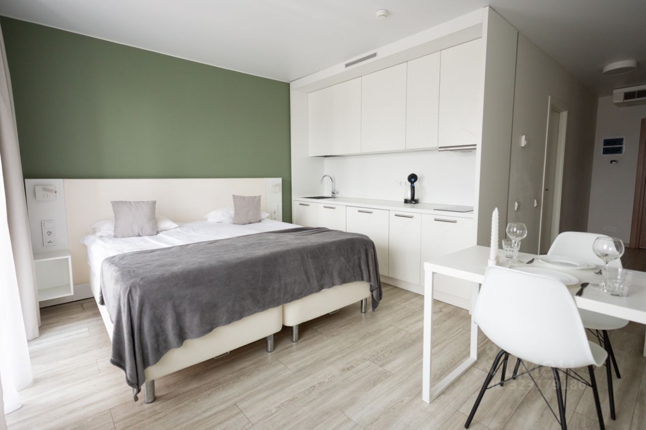 Студия расположена на 8 этаже, что обеспечивает прекрасный вид и тишину. После прогулок по городу вы сможете расслабиться, принять ванну и насладиться просмотром интересных передач по телевизору. Также в наличии стиральная машинка, гладильная доска и сушилка.