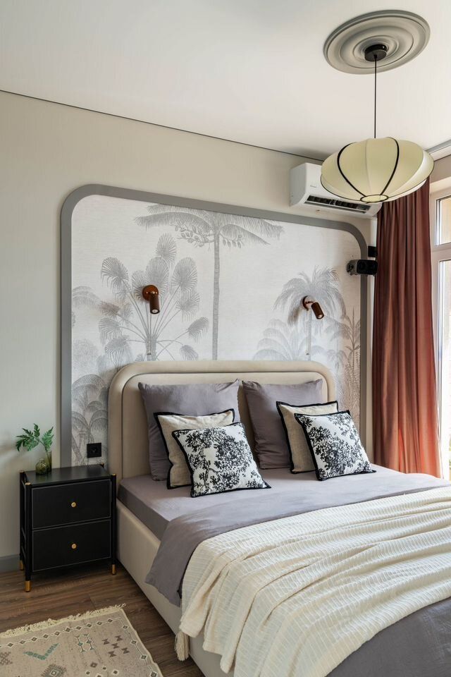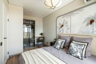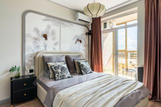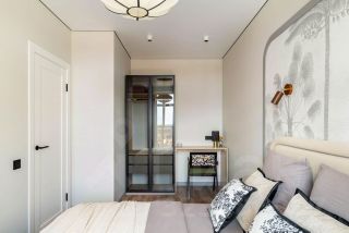В спальне комфортная двуспальная кровать, рабочее место, проектор на стену, кондиционер.