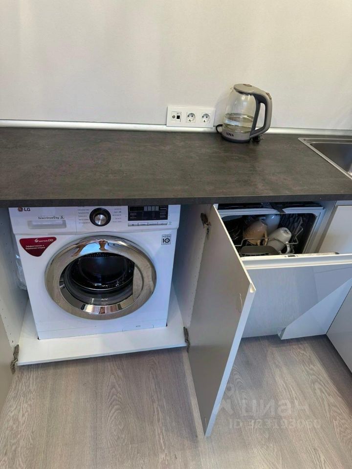 В квартире есть вся необходимая техника — посудомоечная машина, холодильник, стиральная машина, микроволновка, духовой шкаф и чайник.