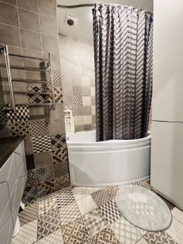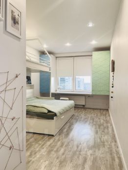 В спальне 3 спальных места: одно спальное место наверху и два внизу (кушетку можно собрать и использовать как диван), имеются большие вместительные шкафы и рабочее место. В совмещенной кухне-гостиной находится комплект раскладного стола и стульев, ТВ, раскладной диван на 2 персоны и бытовая техника для полноценной кухни: микроволновка, холодильник, духовка и посудомоечная машина, чайник. Из дополнительной бытовой техники имеется беспроводной пылесос и стиральная машина со встроенной сушкой.