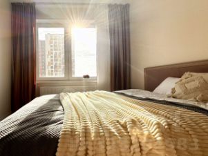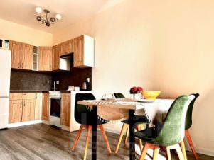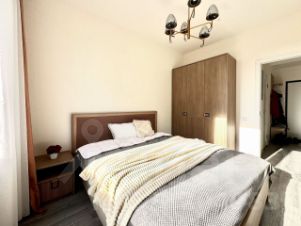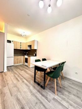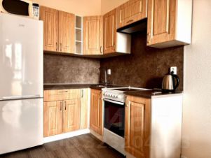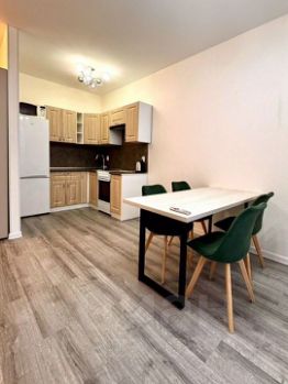 - Мебель: гардеробная, вместительный шкаф для хранения вещей, кровать 160*200, кухонный гарнитур, обеденный стол и стулья.