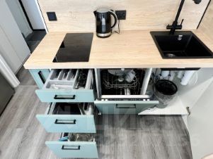 кухня со всей необходимой техникой и домашней утварью ( холодильник, варочная панель, микроволновая печь, чайник, а так же посуда, приборы, сковородки кастюли и т.д.)