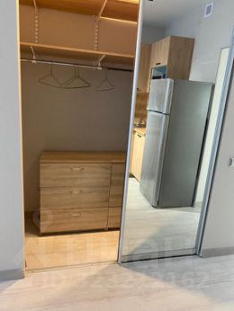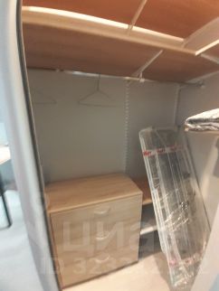 Гардеробная с зеркальными дверьми купе, оснащена комодами, штангами и полками.