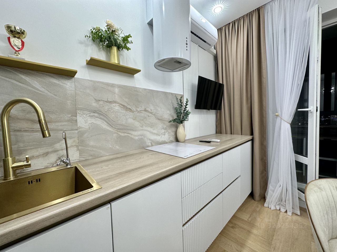 Стильный кухонный гарнитур со всей необходимой техникой: большой посудомоечной машиной, холодильником, варочной панелью, духовым шкафом, вытяжкой, дозатор для моющего и мыла.
