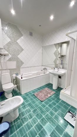 Совмещённый санузел оборудован как ванной, так и душевой кабиной.