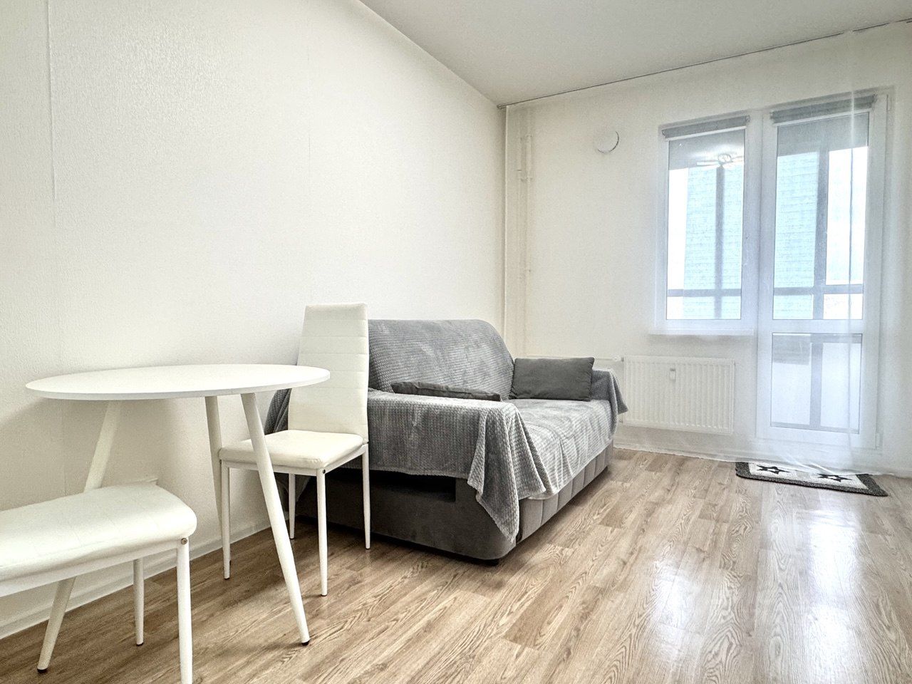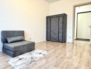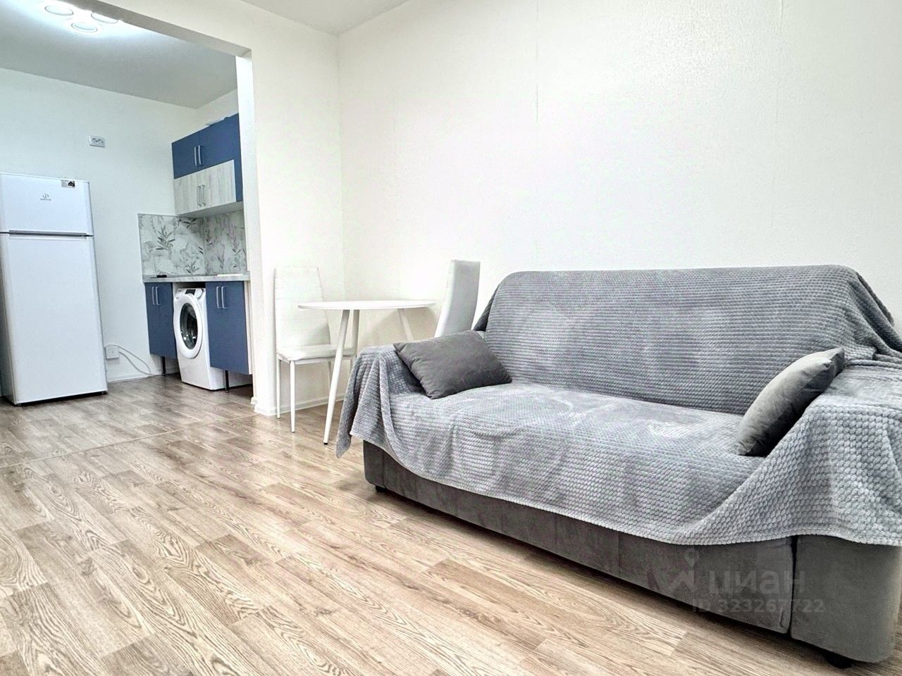 Минимальный набор мебели и техники: кухонная мебель, холодильник, стиральная машина, раскладной диван на кухне, обеденный стол со стульями, небольшое раскладное кресло и шкаф-чехол. Также в квартире есть большой плазменный телевизор, который можно повесить на стену.