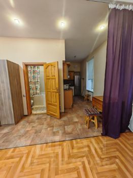 В квартире сделан современный ремонт. Пространство студии обустроено мебелью как в комнате, так и на кухне. Есть холодильник и ванная комната с ванной, поэтому можно сразу заехать и жить без лишних хлопот..