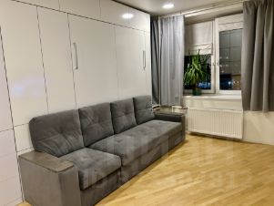 В большой комнате диван трансформируется в полноценную кровать с матрасом за 10 секунд (проще чем стандартный диван разложить), что делает комнату как гостиной так и спальней, там же автоматические шторы блэкаут (открываются и закрываются из приложения или по нажатию беспроводной кнопки) .