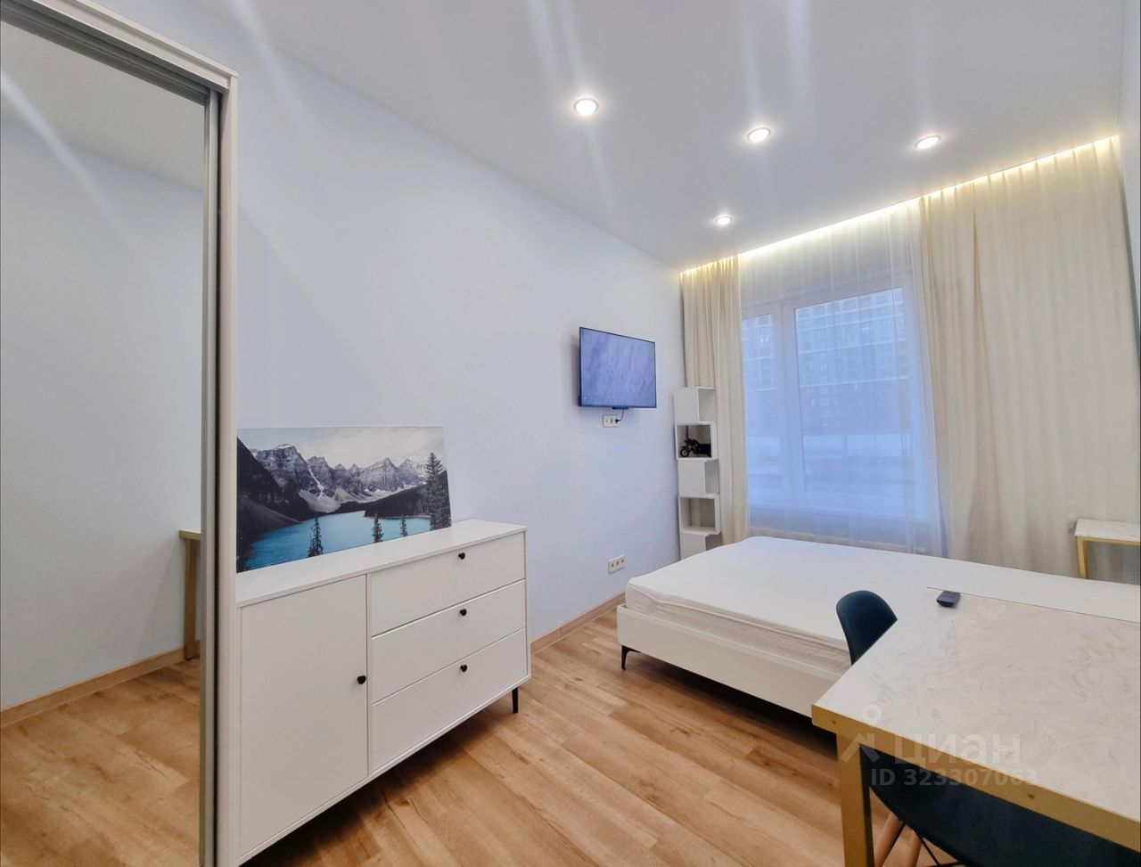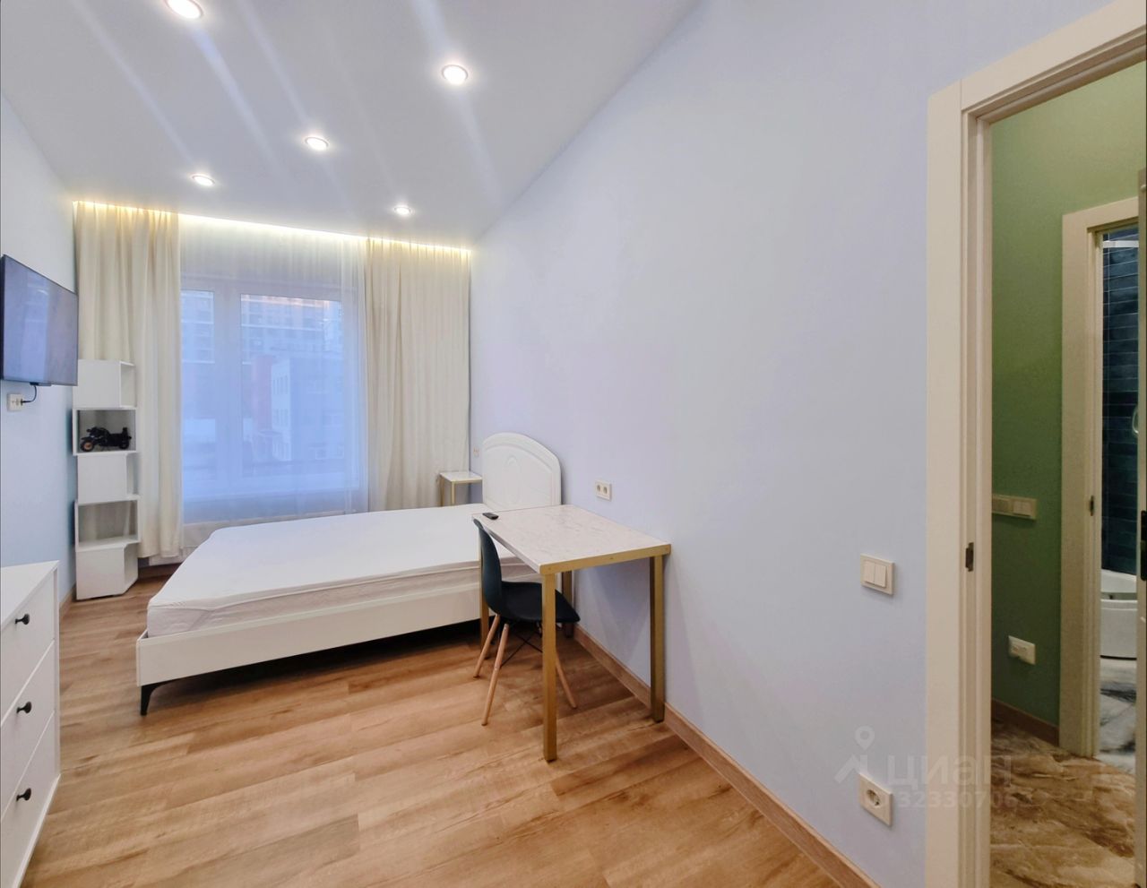 Кровать с ортопедическим матрасом, большой шкаф, прикроватный столик и письменный стол. На всех окнах шторы, мы позаботились о вашем комфорте.