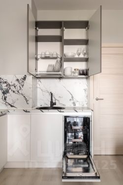 Современная кухня с холодильником, посудомоечной машиной, СВЧ печью, плитой и набором посуды