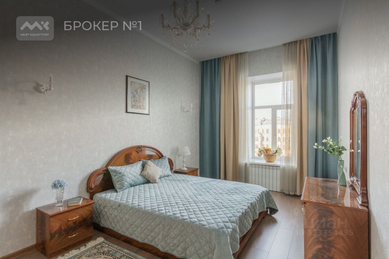Квартира трёхсторонняя, площадью 85,6 м2 состоит из 3-х комнат и расположена на 4 этаже 5-ти этажного дома, парадная чистая в хорошем состоянии, есть лифт, всего 2 квартиры на этаже. Высота потолков 3.36 м. Квартира полностью готова для комфортного проживания и состоит из большой спальни с панорамным окном на Фонтанку, ещё одной уютной спальни, гардеробной комнаты, кухни и просторной гостиной.