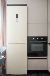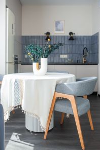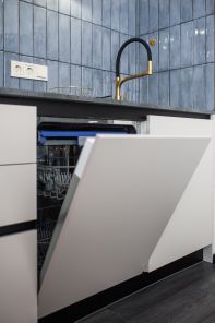 - кухня-гостиная со встроенной техникой: духовой шкаф с функцией СВЧ, варочная панель, холодильник, посудомоечная машина. В зоне гостиной расположен диван и кресло для отдыха;