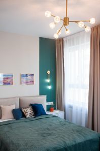 - уютная спальня : двуспальная кровать, вместительный шкаф, рабочая зона ( стол со стулом), кресло в зоне для отдыха.