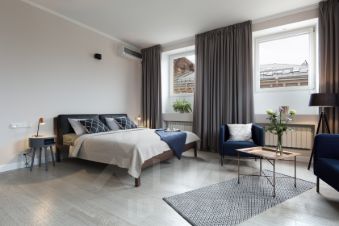 Элегантная квартира в представительском стиле. Спальня открытой планировки пронизана обильным естественным светом, а деревянные половые доски придают ей особую теплоту и комфорт. Из окон открываются замечательные виды на купол Исаакиевского Собора, универмага Au Pont Rouge, крыши и небо Петербурга.