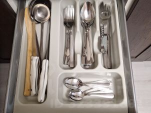 Много кухонных принадлежностей, чай, сахар, соль и многое другое.