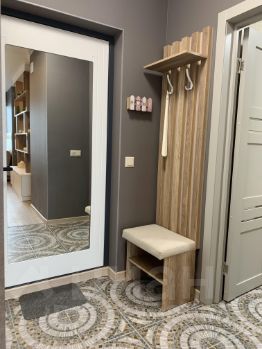 Для хранения вещей имеется гардеробная, расположенная в прихожей, стеллаж и прикроватные тумбы в комнате.