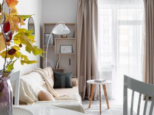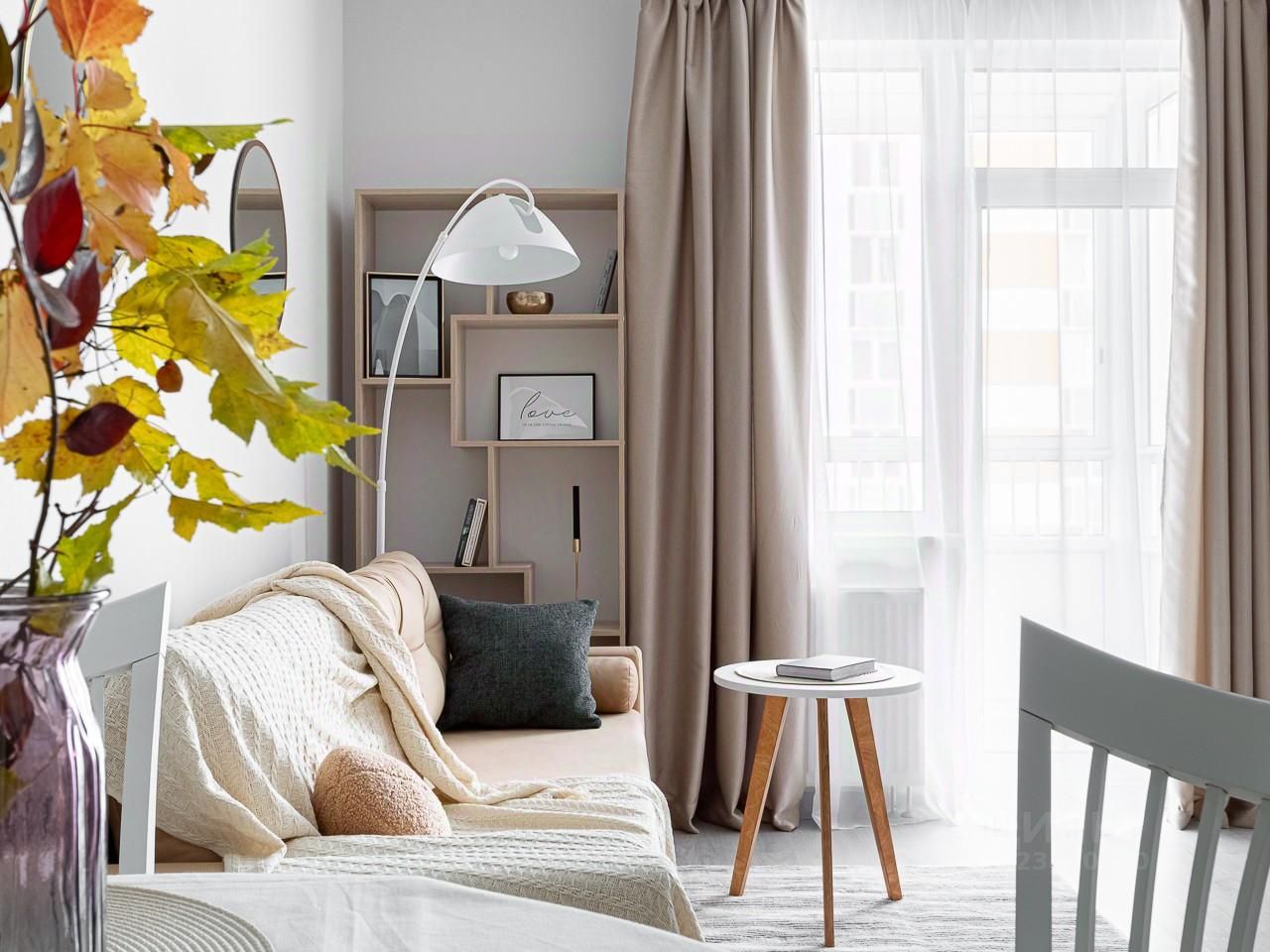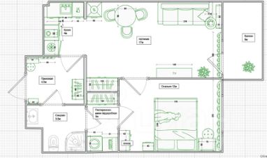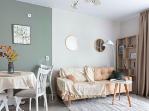 Далее мы попадаем в просторную гостиную 18м, где уже стоит обеденная группа, высокий шкаф для одежды, раскладывающийся диван и тумба под тв.