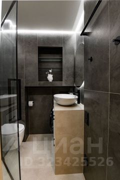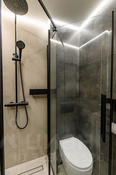 — Совмещенный санузел с тропическим душем, стиральной машиной, теплой стеной и полом, скрытыми полками для хранения.