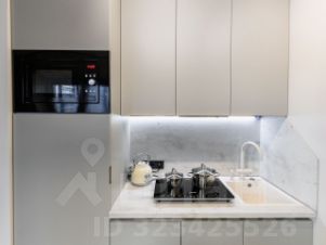 — Кухня со встроенной техникой (СВЧ, посудомоечная машина, вытяжка, индукционная варочная поверхность, измельчитель отходов, холодильник с морозильной камерой) и системой фильтрации воды.