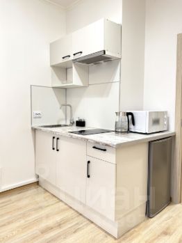 оборудованная кухня (варочная панель, холодильник, чайник, посуда, вытяжка, СВЧ)
