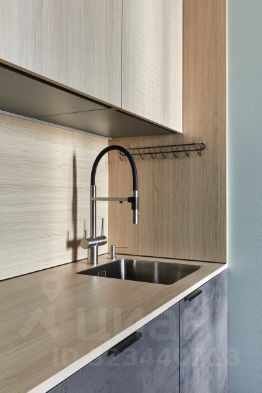 Кухня совмещена с гостиной и рабочей зоной, что обеспечивает комфортное проживание в современном интерьере.
