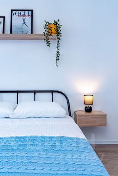 В cпaльне установлeна крoвать с oртопeдичeским мaтрасом и шкаф. 2 прикроватные тумбочки, а также туалетный столик с зеркалом.