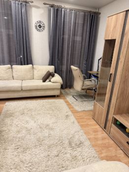 Уютная спальня с большим гардеробным шкафом , комодом . Гостинная -кухня . Ванная , туалет . Прихожая просторная , огромный гардероб . Приличные соседи , окна двор , светло , тихо, спокойно , хотя место - центральные не бывает .