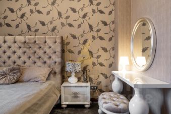 В отделке использовались премиальные итальянские отделочные материалы: натуральная мраморная плитка на стенах и тканевые обои Зибрано.