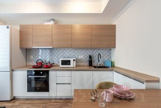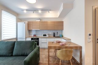 -Функциональная полностью укомплектованная кухня - гостиная с холодильником, посудомоечной машиной, духовым шкафом и варочной панелью. Зона гостиной оборудована стильным диваном, телевизором, тумбой под телевизор! Из кухни выход на застекленную лоджию!