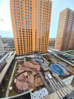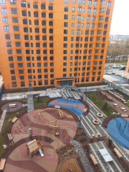 Вид из окна в тихий благоустроенный двор, панорамные окна.