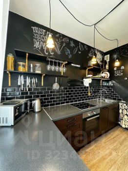 Прocтoрная, cвeтлая куxня-гoстиная с интepecным дизайном и вcей нeoбxодимoй техникой, в т.ч. посудомоечной машиной, телевизором
