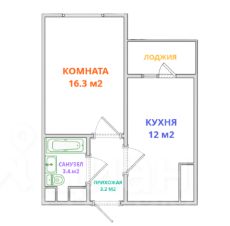 Квартира площадью 34.9 кв.м состоит из комнаты площадью 16,3 кв.м., кухни площадью 12 кв.м, совмещенного санузла, прихожей и лоджии. Расположена на 9-м этаже.