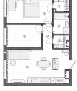 Две изолированных спальных комнаты, одна из которых с отдельной гардеробной. Санузел раздельный. В ванной комнате предусмотрен теплый пол. Есть кондиционеры.