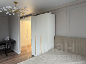 Квартира обладает просторной и функциональной планировкой: прихожая с вместительным шкафом, светлая гостиная с диваном, книжной полкой и рабочей зоной с комфортным креслом, а также уютная спальня с двуспальной кроватью.