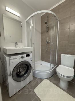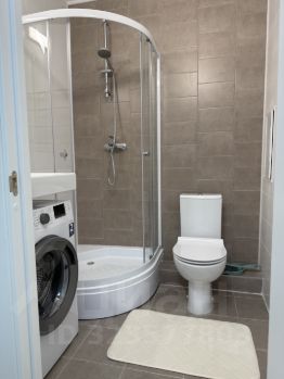 Кухня оборудована необходимой мебелью и техникой, включая холодильник и стиральную машину. В комнате также есть мебель для хранения вещей и отдыха. Ванная комната оснащена душевой кабиной и совмещённым санузлом.