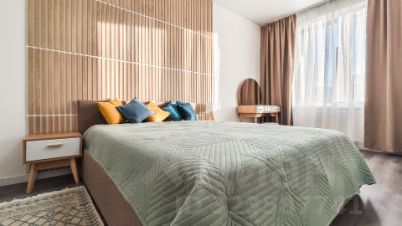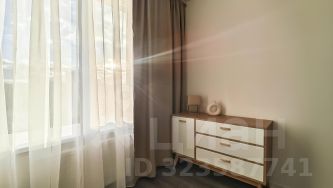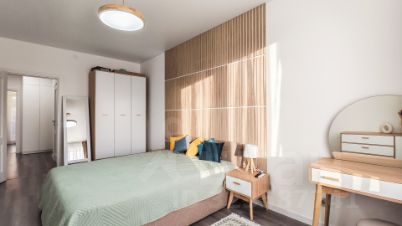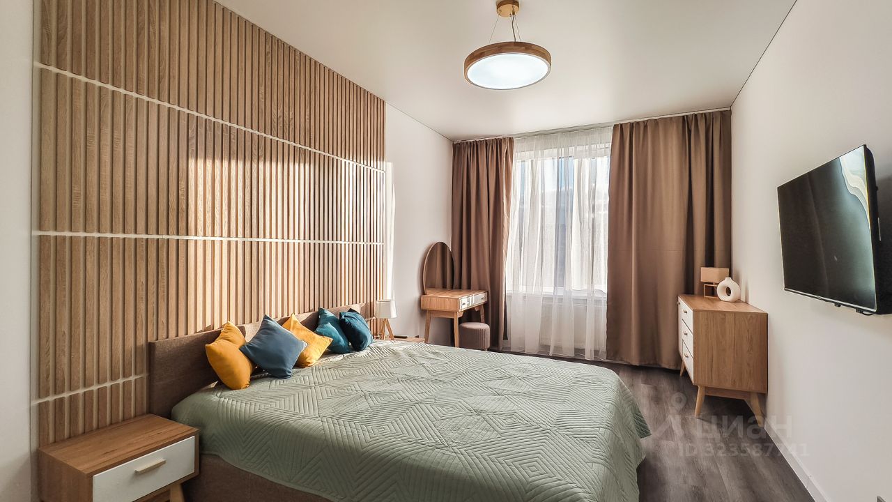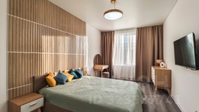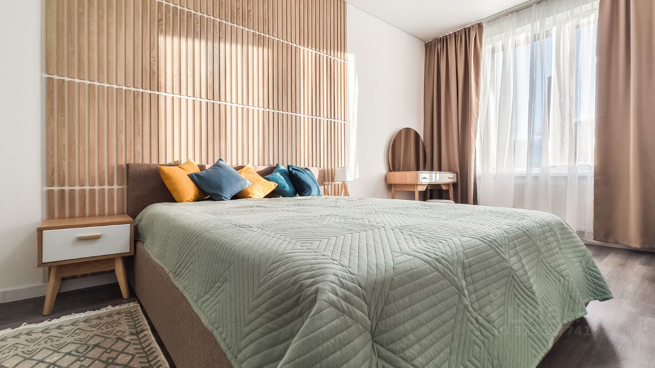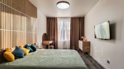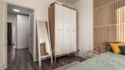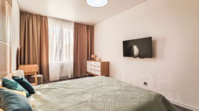 В спальне - удобное бескомпромиссное спальное место - кровать, дополненная прикроватными тумбами, комодом, туалетным столиком, а также напольным зеркалом и вместительным шкафом. Напротив кровати на стене установлен современный телевизор.