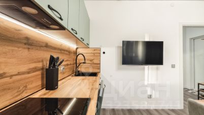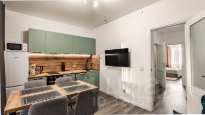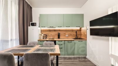 Кухня-гостиная вдоль одной стены оборудована гарнитуром со встроенной техникой: варочной поверхностью, духовым шкафом, вытяжкой, мойкой и фильтром для воды, посудомоечной машиной, а также полноразмерным холодильником и СВЧ-печью. В гостиной части - удобный диван, обеденный стол и четыре мягких стула, на стене установлен телевизор, за дверью - ручной пылесос.