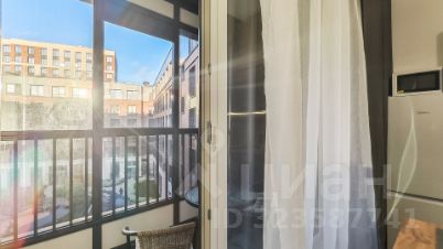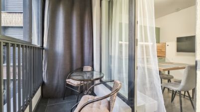 Выход на застеклённый панорамный балкон - из кухни-гостиной, там есть столик и стулья.