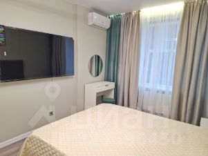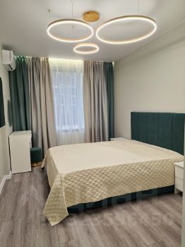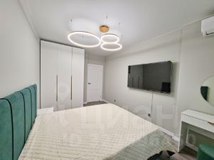В спальне удобное спальное место - кровать, дополненная прикроватными тумбами, туалетным столиком с зеркалом и вместительным шкафом. Напротив кровати на стене установлен современный телевизор.